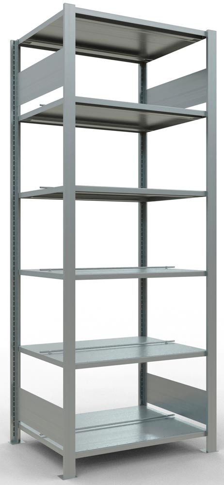 · Ständerrahmen mit Tiefenriegeln, pulverbeschichtet in RAL 7035 lichtgrau · Rahmenfronten ungelocht zur attraktiven Optik · Aussteifung durch Längsriegel · Stahlfachböden mit 25 mm hoher Kante, höhenverstellbar im 25-mm-Raster, RAL 7035 lichtgrau · Mit Mittelanschlag (der Deckboden hat keinen Mittelanschlag) ∙ Zur doppelseitigen Regalbestückung