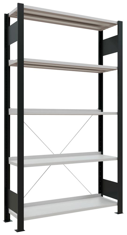· Ständerrahmen mit Tiefenriegeln, pulverbeschichtet in schwarz · Rahmenfronten ungelocht zur attraktiven Optik · Aussteifung durch Kreuzstrebe · Stahlfachböden mit 25 mm hoher Kante, höhenverstellbar im 25-mm-Raster, RAL 7035 lichtgrau · Mit Anschlagleiste (der Deckboden hat keine Anschlagleiste) ∙ Zur einseitigen Regalbestückung