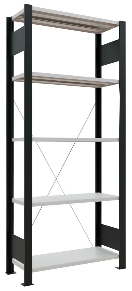 Archiv-Steckregal, Grundfeld, Rahmen schwarz, 5 Fachböden RAL 7035 lichtgrau, ohne Anschlagleiste, Fachlast 85 kg, BxTxH 1000x300x1800 mm EP532601