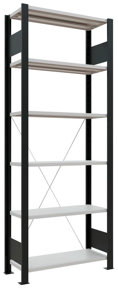 · Ständerrahmen mit Tiefenriegeln, pulverbeschichtet in schwarz · Rahmenfronten ungelocht zur attraktiven Optik · Aussteifung durch Kreuzstrebe · Stahlfachböden mit 25 mm hoher Kante, höhenverstellbar im 25-mm-Raster, RAL 7035 lichtgrau · Ohne Anschlagleiste ∙ Zur einseitigen Regalbestückung
