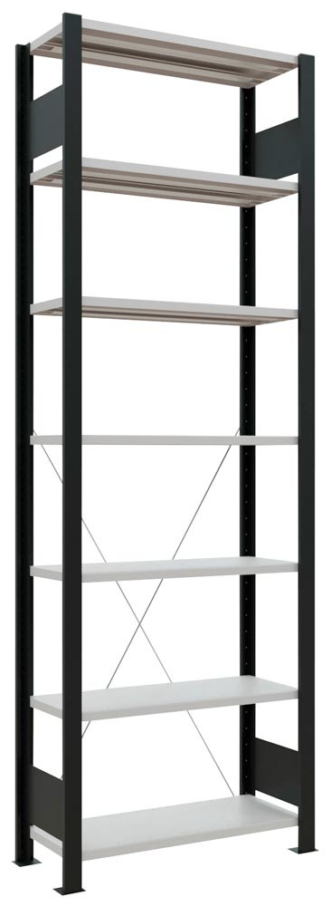 · Ständerrahmen mit Tiefenriegeln, pulverbeschichtet in schwarz · Rahmenfronten ungelocht zur attraktiven Optik · Aussteifung durch Kreuzstrebe · Stahlfachböden mit 25 mm hoher Kante, höhenverstellbar im 25-mm-Raster, RAL 7035 lichtgrau · Ohne Anschlagleiste ∙ Zur einseitigen Regalbestückung