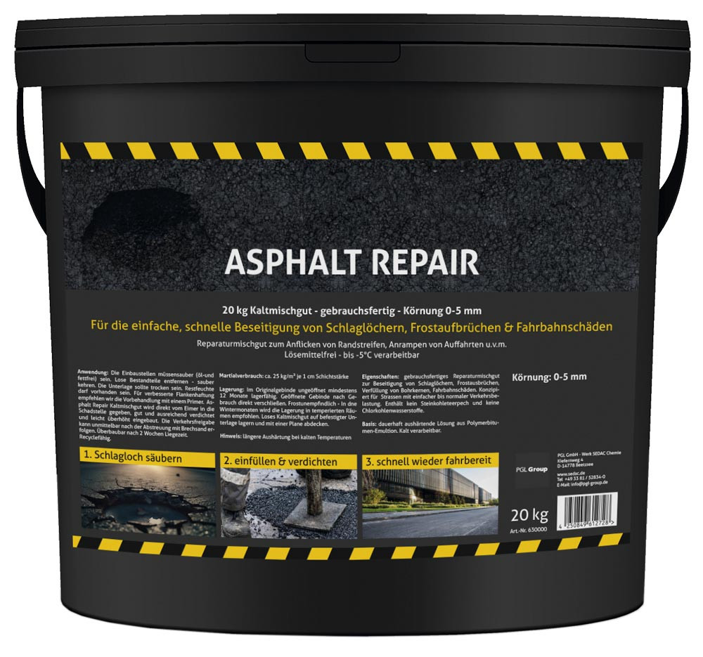 ∙ 20 kg Kaltmischgut, gebrauchsfertig, Körnung 0-5 mm · Gebrauchsfertig · Lösemittelfrei · Verwendbar bis -5°C · Zum Flicken von Randstreifen, Auffahrten, Rampen u. v. m.