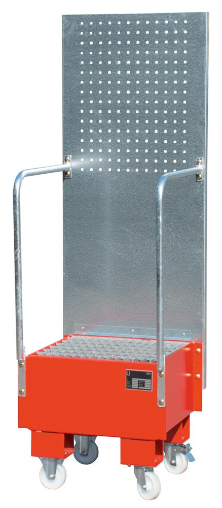 Auffangwanne mit Lochplatte, 3 mm Stahlblech, RAL 3000, fahrbar, für 1 St. 60-l-Fass, stehend Lagern, BxTxH 570x590x1775 mm, Auffangvol. 60 l