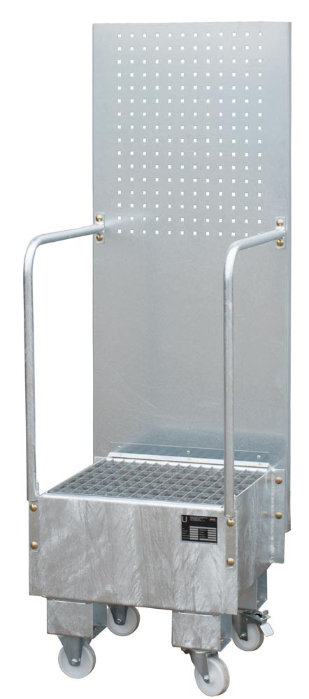Auffangwanne mit Lochplatte, 3 mm Stahlblech, feuerverzinkt, fahrbar, für 1 St. 60-l-Fass, stehend Lagern, BxTxH 570x590x1775 mm, Auffangvol. 60 l