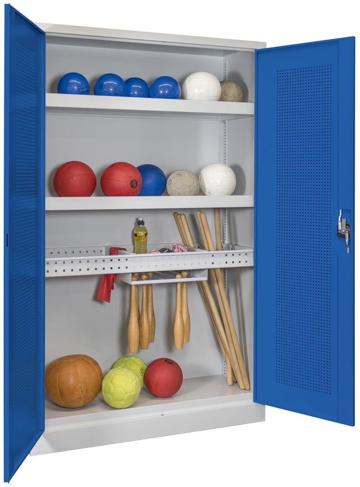 Ballschrank m. Lochblech Flügeltüren, BxTxH 1200x500x1950 mm, 2 Böden, 2 Längs- 2 Quertraversen,Trennsteg, Keulenhalter, Schloss, RAL 7035/5010