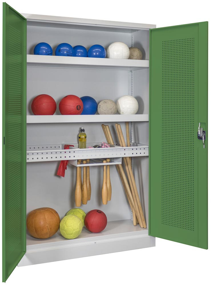 Ballschrank m. Lochblech Flügeltüren, BxTxH 1200x500x1950 mm, 2 Böden, 2 Längs- 2 Quertraversen,Trennsteg, Keulenhalter, Schloss, RAL 7035/6011