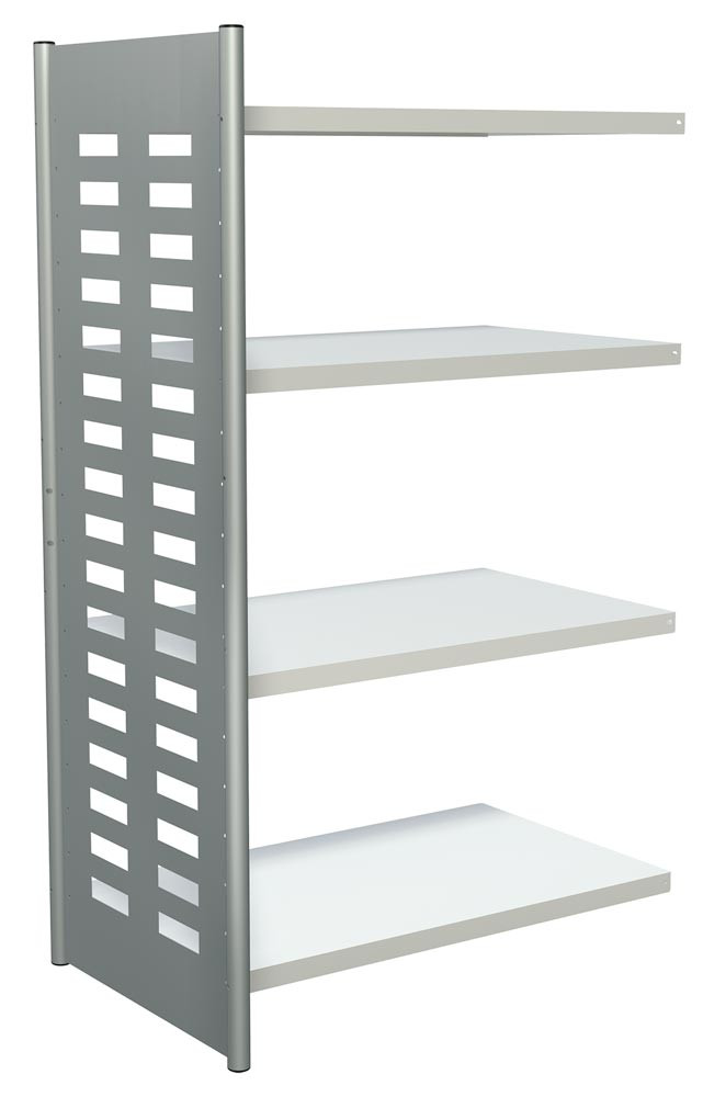 · Seitenrahmen aus Rundrohr Ø 40 mm mit verschweißten Seitenblechen, pulverbeschichtet in alusilber ähnl. RAL 9006 · Fachböden in RAL 7035 lichtgrau, mit Sicherheitskantung 40 mm hoch und höhenverstellbar im Raster von 86 mm