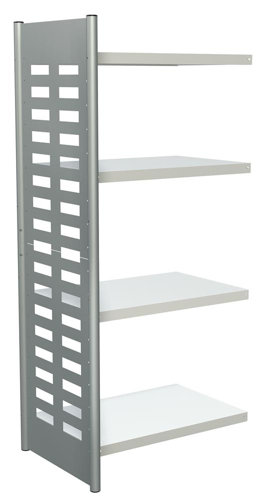 · Seitenrahmen aus Rundrohr Ø 40 mm mit verschweißten Seitenblechen, pulverbeschichtet in alusilber ähnl. RAL 9006 · Fachböden in RAL 7035 lichtgrau, mit Sicherheitskantung 40 mm hoch und höhenverstellbar im Raster von 86 mm
