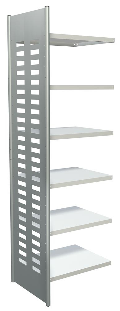 · Seitenrahmen aus Rundrohr Ø 40 mm mit verschweißten Seitenblechen, pulverbeschichtet in alusilber ähnl. RAL 9006 · Fachböden in RAL 7035 lichtgrau, mit Sicherheitskantung 40 mm hoch und höhenverstellbar im Raster von 86 mm