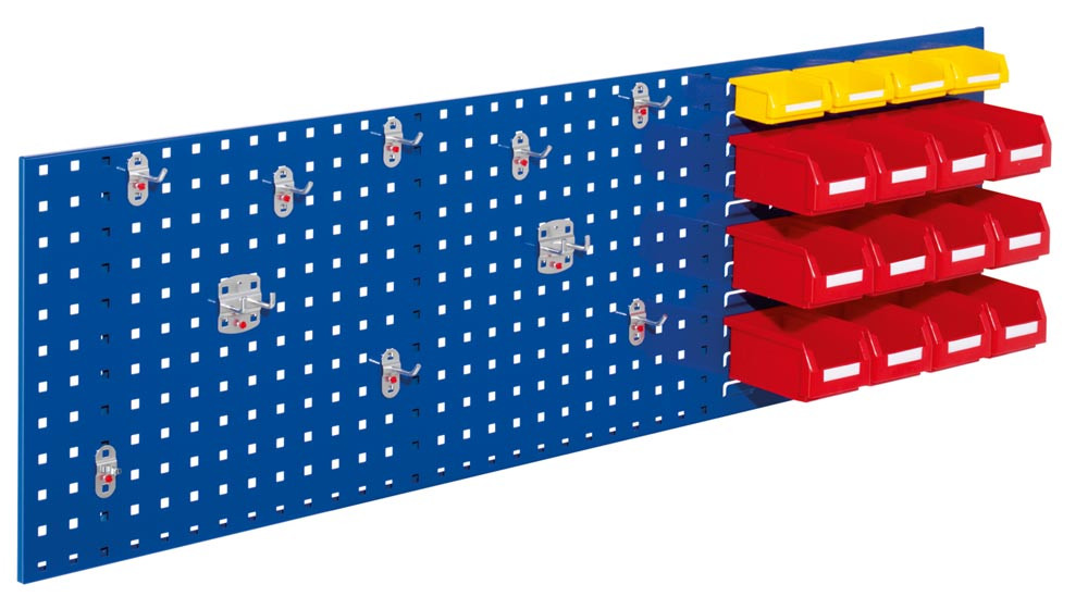 ∙ Einsteigerset bestehend aus: 1 Kombinationsplatte Loch-/ Schlitzplatte 1500 x 450 mm, 10-teiligem Werkzeughaltersortiment, 4 Lagersichtkästen B x T x H 105 x 85 x 45 mm und 8 Lagersichtkästen B x T x H 105 x 160 x 75 mm