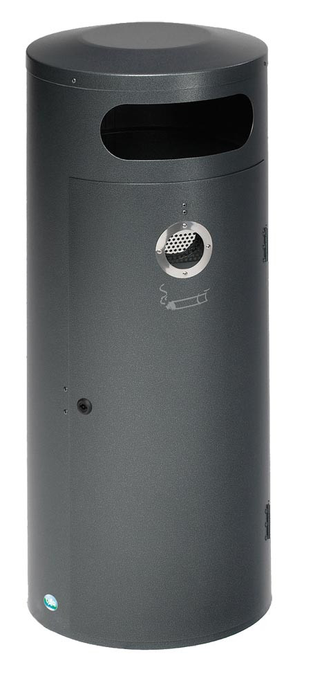 · Gefertigt aus verzinkten Stahlblechen · Oberflächenschutz durch Pulverbeschichtung · Ausgerüstet mit Inneneinsatz aus verzinktem Stahlblech mit Bügelgriffen · Einflügeltür mit Doppelbartschloss und innenliegendem Ascher (Volumen ca. 4,5 L) aus verzinktem Stahlblech, mit Abstreifblech für Zigaretten, abnehmbar · Einwurföffnung in der Tür mit Edelstahl-Ring