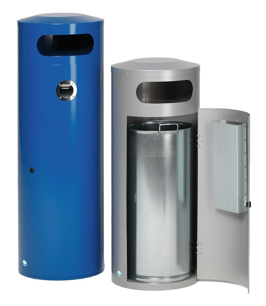 · Gefertigt aus verzinkten Stahlblechen · Oberflächenschutz durch Pulverbeschichtung · Ausgerüstet mit Inneneinsatz aus verzinktem Stahlblech mit Bügelgriffen · Einflügeltür mit Doppelbartschloss und innenliegendem Ascher (Volumen ca. 4,5 L) aus verzinktem Stahlblech, mit Abstreifblech für Zigaretten, abnehmbar · Einwurföffnung in der Tür mit Edelstahl-Ring