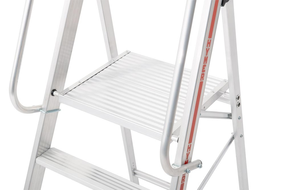 Nach EN 131 ∙ Großflächige Plattform für bequemes und sicheres Stehen ∙ Ergonomisch geformte, beidseitige Handläufe ∙ Aushängbare, starre Streben verhindern unbeabsichtigtes Zusammenklappen ∙ 80 mm Stufentiefe ∙ Plattformabmessung 440 x 400 mm
