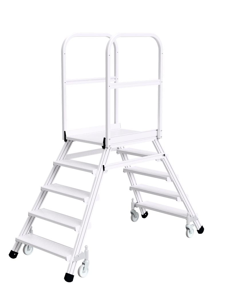 Podesttreppe fahrbar, beidseitig begehbar, Podestgröße 600x800 mm, 2x5 Stufen inkl. Plattform, Standhöhe 1200 mm, Gewicht 42,7 kg