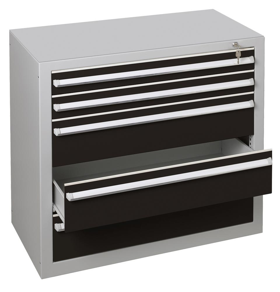 Schubladenblock (Flügeltür) 900x1000x500 mm, Schubladen 2 x 100 mm, 3 x 200 mm inkl. Abschlussblende, RAL 7035 lichtgrau/RAL 9005 tiefschwarz EP561704