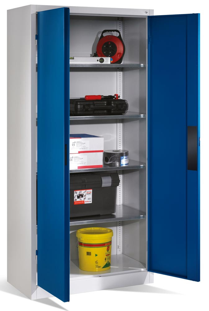· Besonders stabile, verwindungssteife Stahlblechkonstruktion · Hochwertige Einbrennbeschichtung · Schränke mit gemeinsam verschließbaren Flügeltüren mit Verstärkungsprofilen · Türöffnungswinkel 180° · 3-riegeliges-Griffschloss mit patentiertem Mechanismus · Schranklast bis 700 kg · Ausgestattet mit 4 Fachböden im Raster von 15 mm verstellbar, Traglast je Fachboden 110 kg bei gleichmäßig verteilter Last