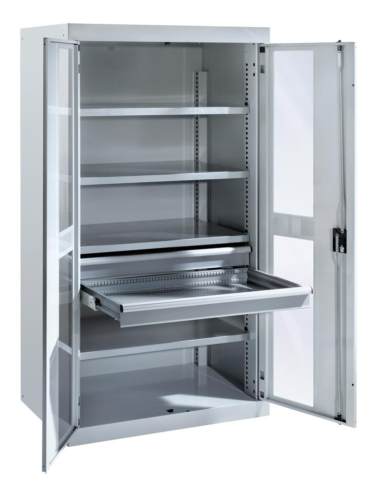 Schwerlastschrank, Sichtfenstertüren, Zylinderschloss, BxTxH 1100x641x1950 mm, RAL 7035 EP529210