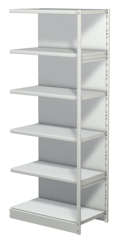 ∙ Optimale Raumausnutzung ∙ Fachböden 30 mm stark, im Raster von 59 mm höhenverstellbar ∙ Regalpfosten aus Kastenprofilen mit glatten Fronten ∙ Serienmäßig mit bodenbündiger Sockelblende ∙ Mit zusätzlichen Fachböden, Fachteilern, Seiten- und Trennstegen und Pendelhefterschienen individuell auszustatten ∙ Türen-Anbausätze, Seitenblenden und Zwischenwände ermöglichen die problemlose Integration von Schrankelementen ∙ Hochwertige Pulverbeschichtung in RAL 7035 lichtgrau