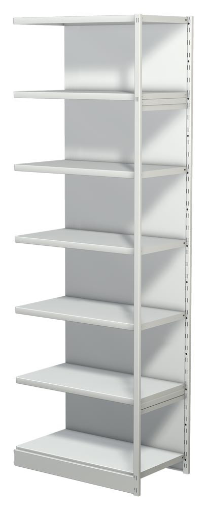 ∙ Optimale Raumausnutzung ∙ Fachböden 30 mm stark, im Raster von 59 mm höhenverstellbar ∙ Regalpfosten aus Kastenprofilen mit glatten Fronten ∙ Serienmäßig mit bodenbündiger Sockelblende ∙ Mit zusätzlichen Fachböden, Fachteilern, Seiten- und Trennstegen und Pendelhefterschienen individuell auszustatten ∙ Türen-Anbausätze, Seitenblenden und Zwischenwände ermöglichen die problemlose Integration von Schrankelementen ∙ Hochwertige Pulverbeschichtung in RAL 7035 lichtgrau