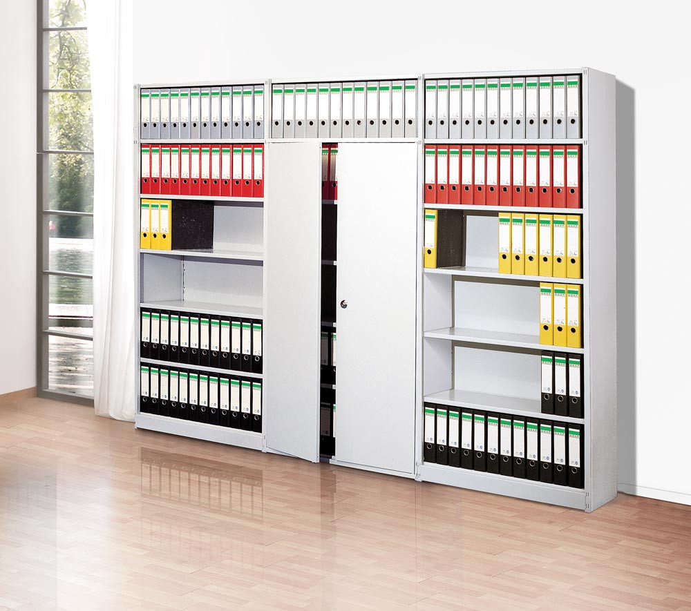 ∙ Optimale Raumausnutzung ∙ Fachböden 30 mm stark, im Raster von 59 mm höhenverstellbar ∙ Regalpfosten aus Kastenprofilen mit glatten Fronten ∙ Serienmäßig mit bodenbündiger Sockelblende ∙ Mit zusätzlichen Fachböden, Fachteilern, Seiten- und Trennstegen und Pendelhefterschienen individuell auszustatten ∙ Türen-Anbausätze, Seitenblenden und Zwischenwände ermöglichen die problemlose Integration von Schrankelementen ∙ Hochwertige Pulverbeschichtung in RAL 7035 lichtgrau