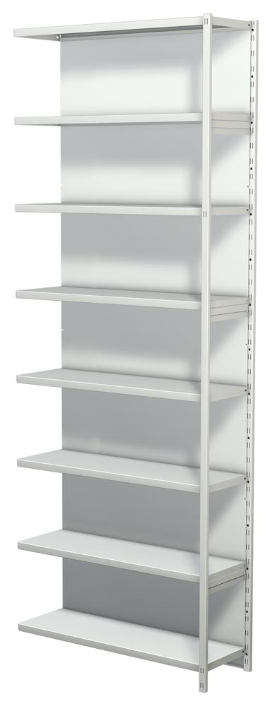 Steckregal mit Rückwand, Grundfeld, 8 Fachböden, 7 OH, BxTxH 750x300x2600 mm, lichtgrau EP518686