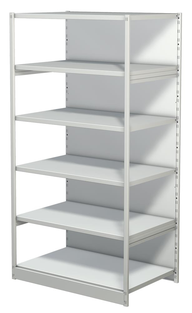 ∙ Optimale Raumausnutzung ∙ Fachböden 30 mm stark, im Raster von 59 mm höhenverstellbar ∙ Regalpfosten aus Kastenprofilen mit glatten Fronten ∙ Serienmäßig mit bodenbündiger Sockelblende ∙ Mit zusätzlichen Fachböden, Fachteilern, Seiten- und Trennstegen und Pendelhefterschienen individuell auszustatten ∙ Türen-Anbausätze, Seitenblenden und Zwischenwände ermöglichen die problemlose Integration von Schrankelementen ∙ Hochwertige Pulverbeschichtung in RAL 7035 lichtgrau