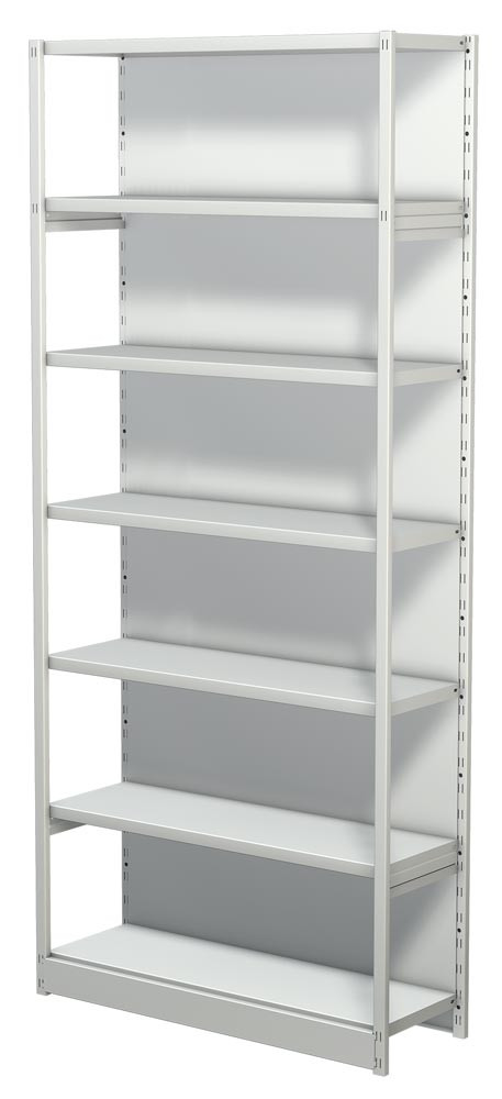 Steckregal mit Rückwand, Grundfeld, 7 Fachböden, 6 OH, BxTxH 960x300x2250 mm, lichtgrau EP518684