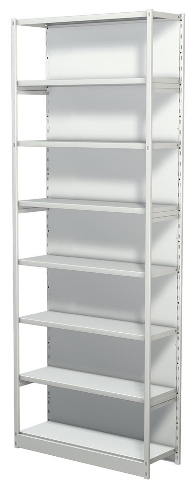 Steckregal mit Rückwand, Grundfeld, 8 Fachböden, 7 OH, BxTxH 960x300x2600 mm, lichtgrau