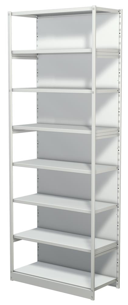 Steckregal mit Rückwand, Grundfeld, 8 Fachböden, 7 OH, BxTxH 750x300x2600 mm, lichtgrau EP518686