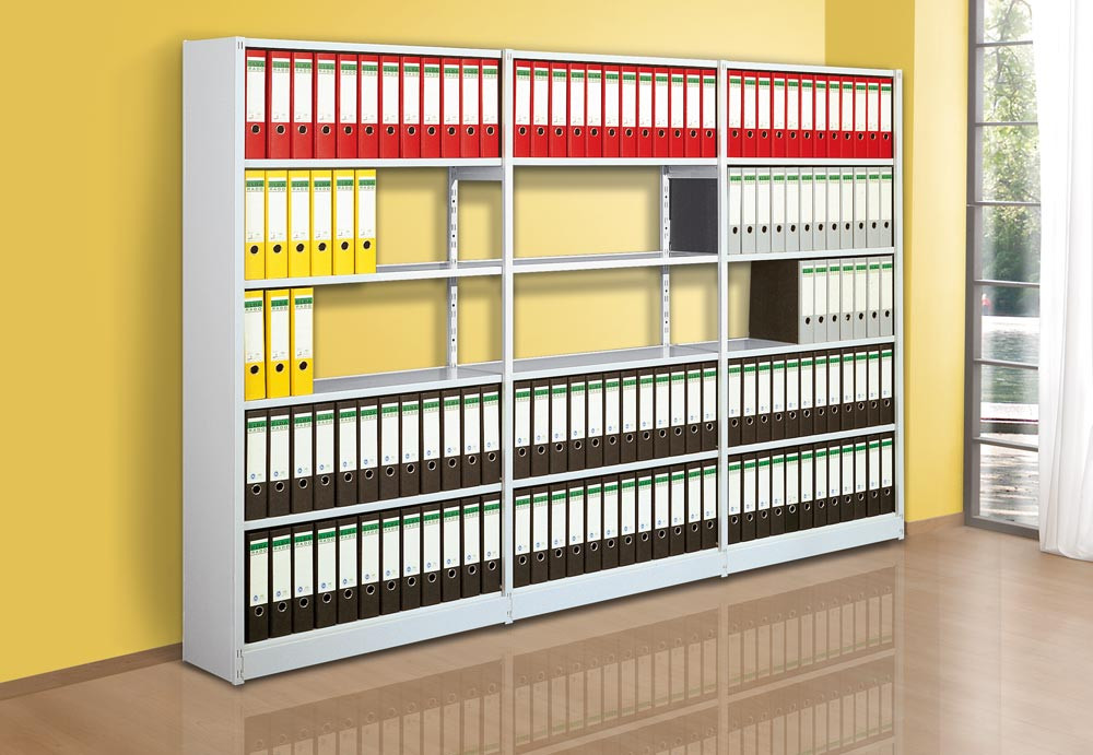 ∙ Optimale Raumausnutzung ∙ Fachböden 30 mm stark, im Raster von 59 mm höhenverstellbar ∙ Regalpfosten aus Kastenprofilen mit glatten Fronten ∙ Serienmäßig mit bodenbündiger Sockelblende ∙ Mit zusätzlichen Fachböden, Fachteilern, Seiten- und Trennstegen und Pendelhefterschienen individuell auszustatten ∙ Türen-Anbausätze, Seitenblenden und Zwischenwände ermöglichen die problemlose Integration von Schrankelementen ∙ Hochwertige Pulverbeschichtung in RAL 7035 lichtgrau