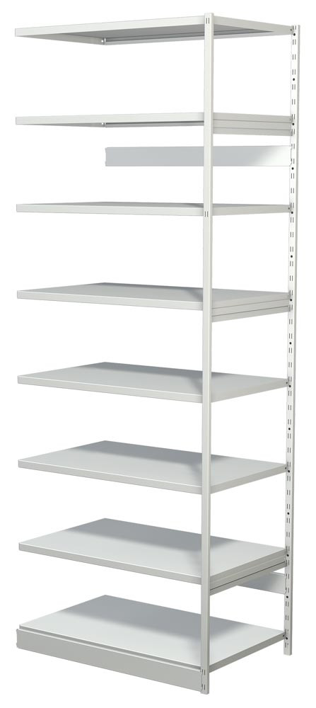 Steckregal ohne Rückwand, Anbaufeld, 8 Fachböden, 7 OH, BxTxH 960x300x2600 mm, lichtgrau EP518638