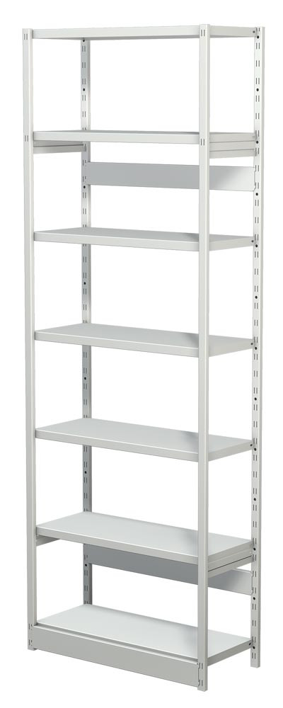 Steckregal ohne Rückwand, Grundfeld, 7 Fachböden, 6 OH, BxTxH 750x300x2250 mm, lichtgrau