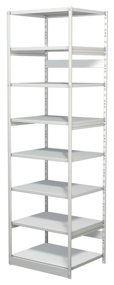 ∙ Optimale Raumausnutzung ∙ Fachböden 30 mm stark, im Raster von 59 mm höhenverstellbar ∙ Regalpfosten aus Kastenprofilen mit glatten Fronten ∙ Serienmäßig mit bodenbündiger Sockelblende ∙ Mit zusätzlichen Fachböden, Fachteilern, Seiten- und Trennstegen und Pendelhefterschienen individuell auszustatten ∙ Türen-Anbausätze, Seitenblenden und Zwischenwände ermöglichen die problemlose Integration von Schrankelementen ∙ Hochwertige Pulverbeschichtung in RAL 7035 lichtgrau