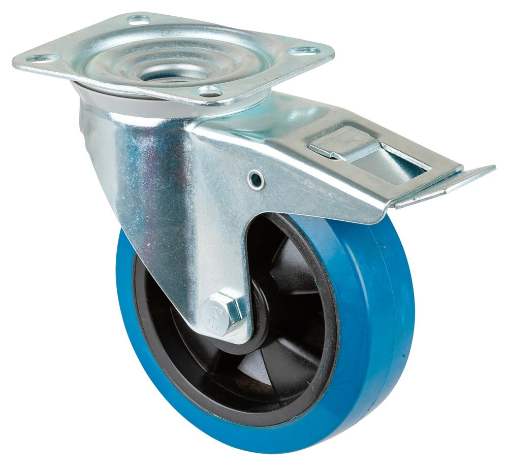 Transportgeräte-Lenkrolle m. Festst., Elastik-Vollgummi blau,Durchm. 160 mm, Traglast 300 kg, Kugellager, Anschraubplatte