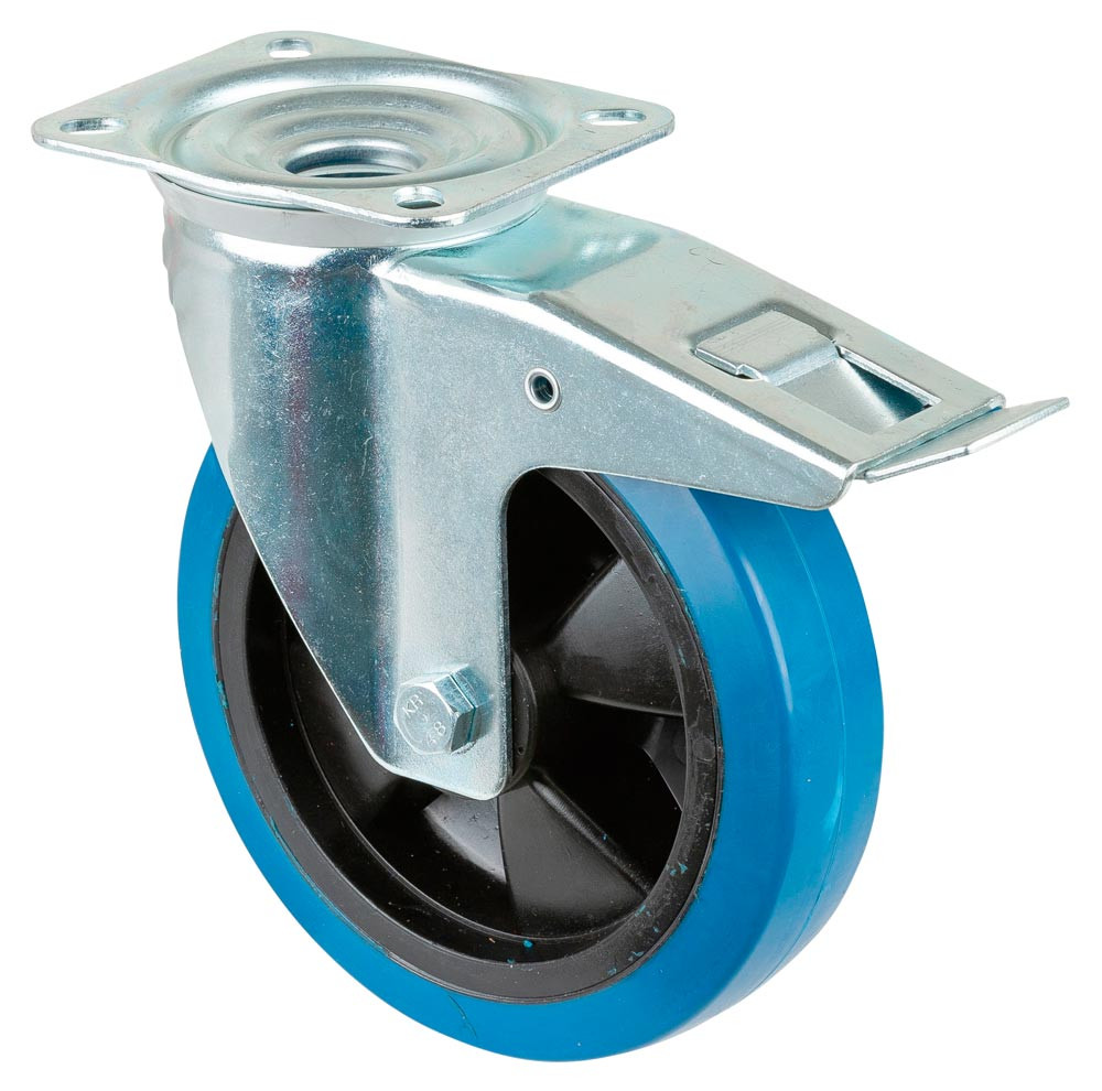 Transportgeräte-Lenkrolle m. Festst., Elastik-Vollgummi blau,Durchm. 200 mm, Traglast 300 kg, Kugellager, Anschraubplatte