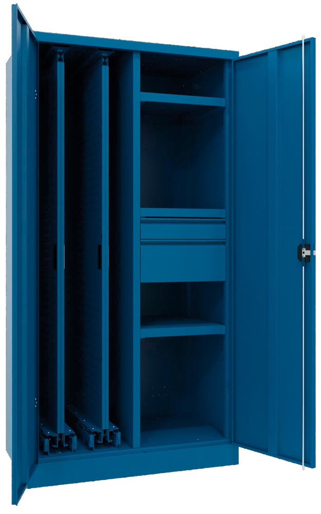 Vertikalauszugschrank, 2 Auszüge mit Lochplatten, Mitteltrennwand, 3 Böden, 2 Schubladen (1x100 mm, 1x200 mm), BxTxH 1000x600x1950 mm, RAL 5010 EP562243