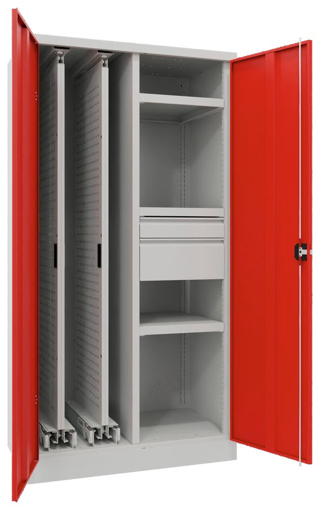 Vertikalauszugschrank, 2 Auszüge mit Lochplatten, Mitteltrennwand, 3 Böden, 2 Schubladen (1x100 mm, 1x200 mm), BxTxH 1000x600x1950 mm, RAL 5010 EP562243