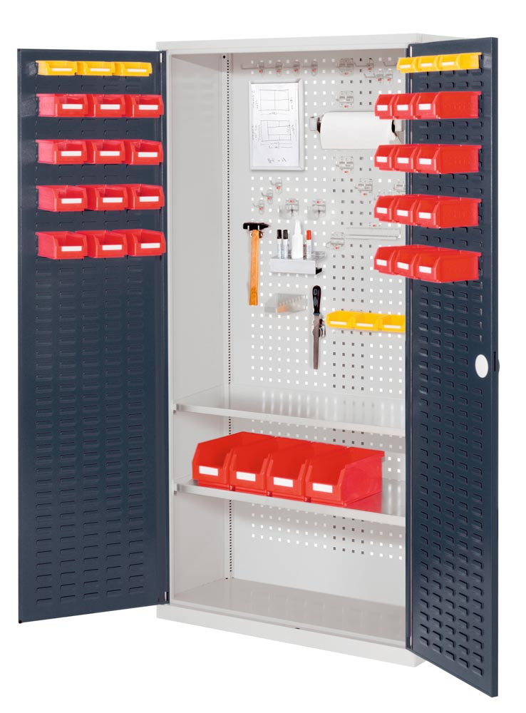 ∙ Hochwertiges Werkzeug, empfindliche Arbeitsgeräte und diverse Kleinteile sicher und übersichtlich untergebracht ∙ Korpus aus geschweißtem Stahlblech ∙ Mit Lochraster in der Rückwand ∙ Aufschlagende, doppelwandige Flügeltüren, Öffnungswinkel > 200° ∙ Dreiriegeliges Sicherheits-Zylinderschloß mit versenktem